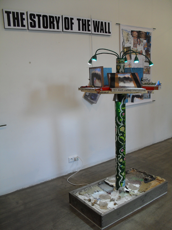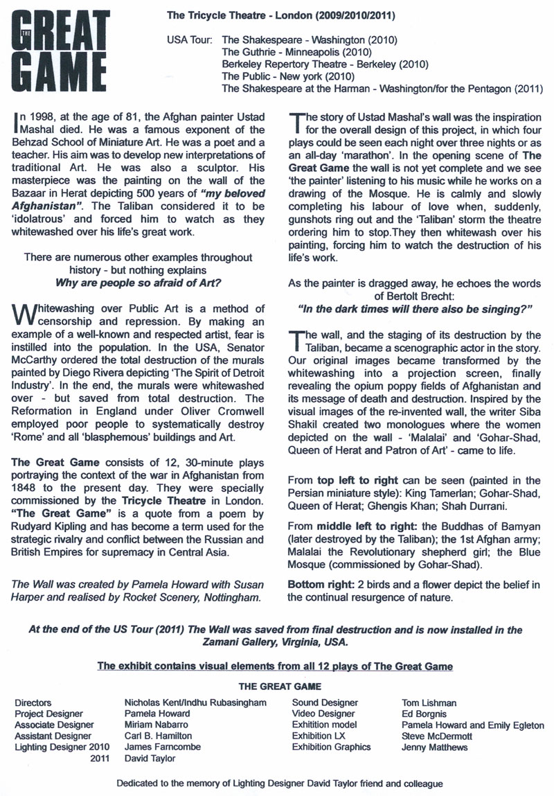 “The Story of the Wall” is an artefact taken from the Tricycle Theatre London’s highly successful production of The Great Game 2009/2010 and USA tour 2010/2011. It was conceived for the Society of British Theatre Designers exhibition in Cardiff in March 2011 to respond to the theme “Transformation and Revelation”. It shows how the principal scenographic element - a wall 5 metres high x 13 metres wide built on a simple hydraulic system transformed from an exterior wall to an Afghan Poppy field, following the content of the 12½ hour specially commissioned plays that made up The Great Game. The Carousel was inspired by a photo of an Afghan child in a destroyed landscape going to a fairground and playing with a miniature diorama. Each stage of the Wall is held between the points of a Red Soviet Star, which sits on top of a golden Pentagon. The viewer can turn the carousel. A central pole is painted in the Nuristani style and depicts the life cycle of the poppy, and the carousel stands on a base depicting an Afghan landscape as if seen from the air. It is entirely constructed out of found and discarded materials.