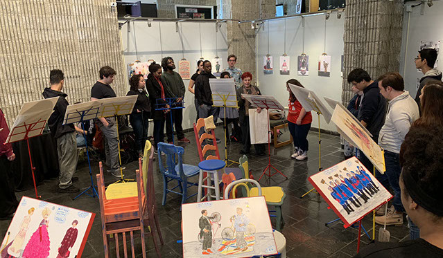 I feel extremely honoured to have been invited by the Central Academy of Drama Beijing to have this wonderfully curated retrospective exhibition of my works as Director/Scenographer (Visual Theatre Artist). In this beautiful White Space, where in 2017 with design students of CAD we made a wonderful immersive event The Metaphysical World of Macbeth. I asked for my work, which is always with music, to be displayed on music stands. I like people to be able to touch and feel my work, which is good for visitors who are sometimes in wheelchairs or with sight impairments, and they can enjoy the work as others do. Each of the productions are shown in separate areas of The White Space, and each space is playing recordings or in some cases films of the productions. My practice is to use every production I do as a chance to experiment with different materials and surfaces to work on. For example the characters for The Marriage are painted onto the backs of Brown Paper carrier bags from Wholefoods Supermarkets in Pittsburg, CA USA which is where I started this project. By contrast, The Greek Passion (a great grand opera by Czech Composer Bohuslav Martinu) drawings are made on cardboard, covered in plasticine, and then scraped away with pins, knives, needles, and anything else that I found could make a mark. The Greek Passion was presented in the 11th Century citadel overlooking the sea in Thessaloniki, Northern Greece, a UNESCO World Heritage Site, and was an unforgettable experience. By contrast, my paintings for Bizet’s famous Opera Carmen were inspired by passing Halfords on the Portfield Retail Estate, Chichester that were offering Chamois leather car cleaning cloths 3 for the price of 2. I looked at them and fell in love with the feel and texture of the cloths that made me think of the dry hills of Andalusia, Spain where I have been many times. The cloths were all different shapes which allowed me to easily draw and paint responding to the form of the cloths. The exhibition also celebrates the translation into Chinese by Professor Lu Ning of the 3rd edition of my book “What is Scenography?