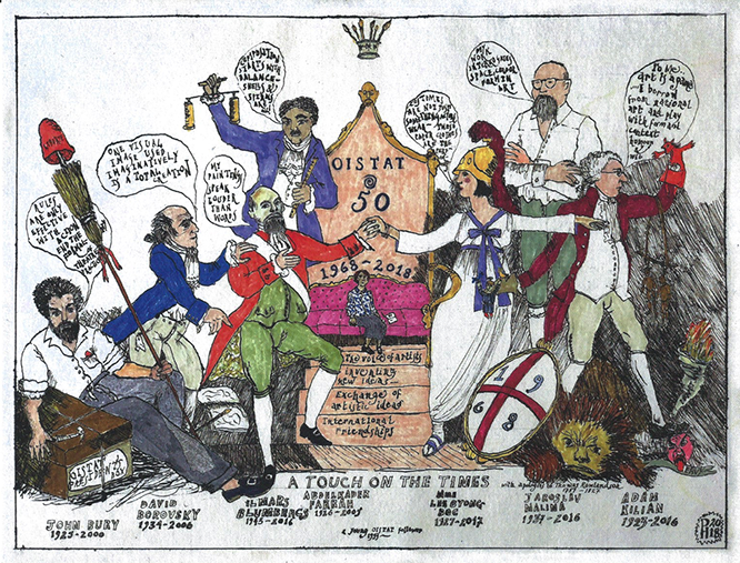 A Touch on the Times is a large hand drawn artwork in old-fashioned pen and Indian ink and watercolours on hot pressed watercolour paper. It was produced for the OISTAT@50 celebrations hosted by Royal Welsh College of Music and Drama. The drawing is adapted from Thomas Rowlandson’s satiric drawing , but substituting famous figures who were part of the Organisation Internationale des Scenographes, Techniciens et Architectes de théâtre that was an offshoot of the Unesco initiative The international Theatre Institute started in 1948 under the directorship of Julian Huxley to mend cultural bridges that had been broken after the 2nd World War. In 1968 the Scenographic Commission of ITI became an autonomous organisation and was for many years the organiser of the Prague Quadrennial, which in turn became an autonomous organisation. All this simply demonstrates the importance of artists working together and creating events. My drawing shows simply 7 people who are no longer with us, but who I knew, and whose legacy lives on. In the speaking bubbles are quotes I noted from conversation and discussions. I am the small person sitting on a very large Chair and on the steps are the early aims of OISTAT that are as relevant today as they were in 1968.